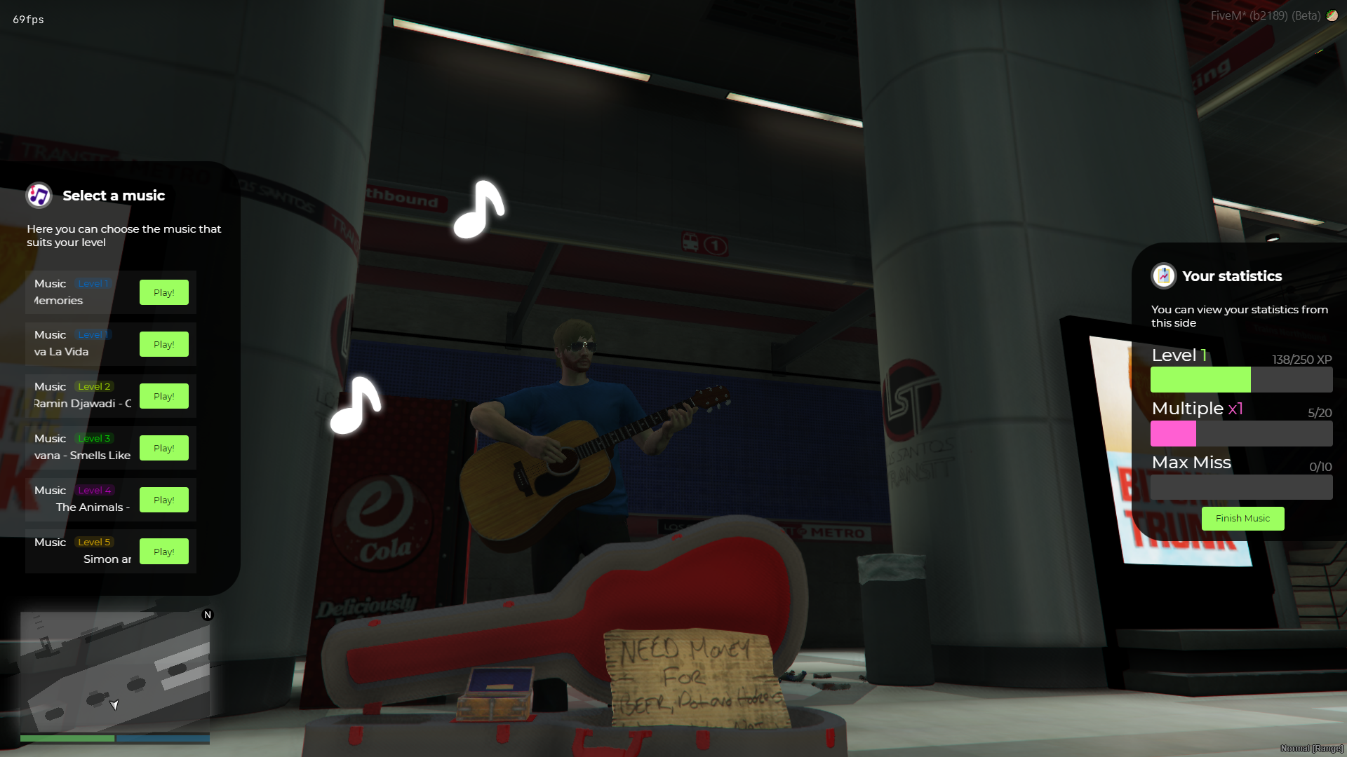 Bring street performance to life with the Busker Script for FiveM! This script allows players to become street musicians, playing music, collecting d0nations, and leveling up their skills. The more you play, the better you get, unlocking new songs and attracting bigger crowds.